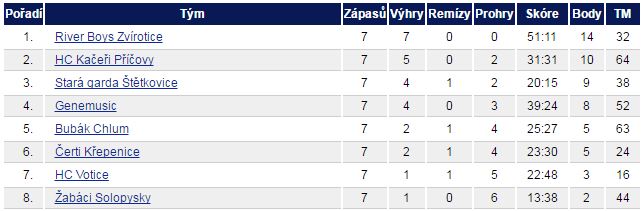 Již několik let se nám nepovedl start do sezóny tak jako letos. Během prvního kola se nám podařilo získat 4 bodový náskok na druhé Kačery z Příčov a dokonce 6 bodový na úřadující mistry Genemusic. Rozhodnutí PK změnit hrací systém nám bohužel nepřálo. Po prvním kole se skupiny "přeskládaly", všechny body se anulovaly a nyní začínáme hrát soutěž od začátku. Nám nezbývá nic jiného než hrát náš nejlepší hokej a potvrdit tak formu ze začátku sezóny.